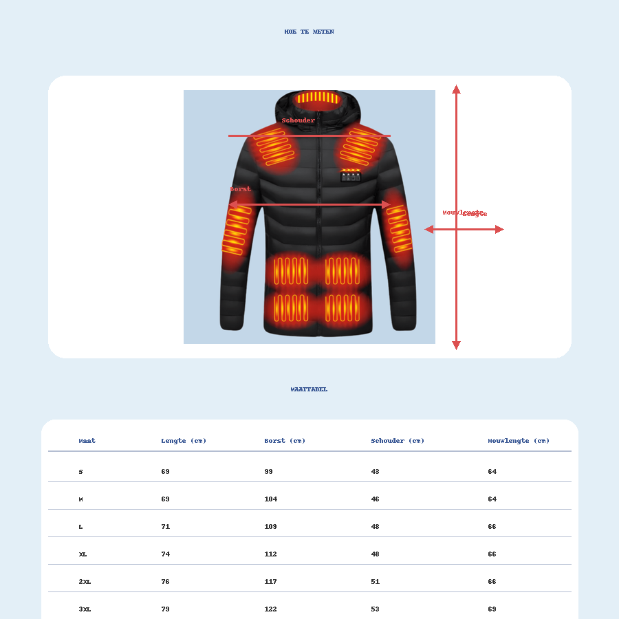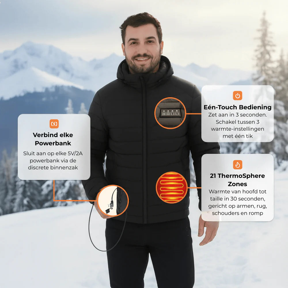 Je hoeft geen compromis meer te sluiten tussen warmte en comfort. Dankzij de 21 verwarmingszones blijft jouw bovenlichaam gelijkmatig warm, zonder dat je dik ingepakt hoeft te zijn. De jas is unisex, verkrijgbaar in meerdere maten en ideaal voor dagelijks gebruik, werk, reizen, wintersport en avondwandelingen.